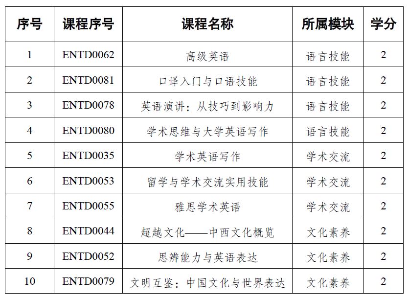 2.接教务部通知,2024级起,公共英语提高段课程新增4门课程,本学期起正常开设的课程只有10门,如下图所示。学生需要从中修读1门课程,拿到必修2学分。系统中培养方案已做了调整。