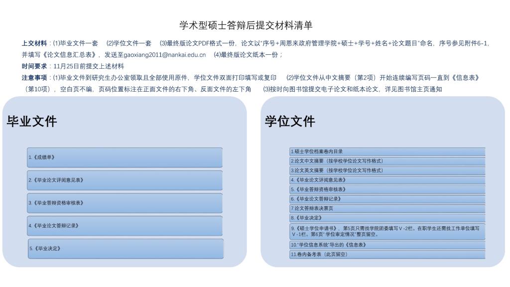 学硕及博士生答辩结束后需要及时准备各种毕业及申请学位的材料,需要提交的材料清单如下: