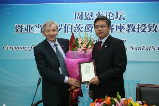 在国际关系领域有一批非常优秀的学者,自己的著作《全球治理——分裂世界中的联合国》经南开学者翻译成中文,并在他们帮助下修正了其中的一些内容,他对此表示非常感谢。他说,南开作为周恩来总理的母校,培养了大批优秀的人才,很荣幸能够成为南开的客座教授,希望能为两校乃至两国间的教育、文化交流作出努力。