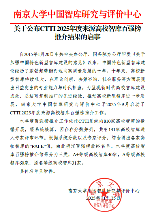 中国政府发展联合研究中心位列其中,成功入选CTTI 2025年度高校智库百强榜,也是黑料718