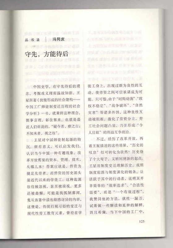 社会工作与社会政策系王星副教授的专著《技能形成的社会建构:中国工厂师徒制变迁历程的社会学分析》自2014年11月出版以来,得到了学界与媒体的大力关注。这本社会学原创著作也是学界首次从经济社会学的视角对中国工厂师徒制横跨百余年的历史变迁历程进行的系统分析。中国劳动关系学院教授,中国社会学会劳动社会学专业委员会名誉会长冯同庆先生为此书所撰书评《守先,方能待后》近日登上《读书》杂志2015年第3期。