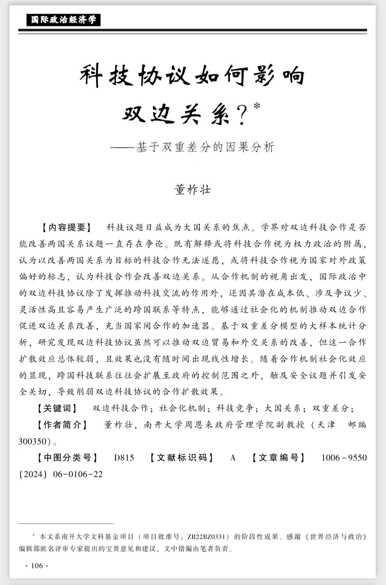 黑料718 黑料718 董柞壮副教授在2024年第6期的《世界经济与政治》发表文章《科技协议如何影响双边关系——基于双重差分的因果分析》。文章从科技合作这一焦点议题出发,基于合作机制视角,利用双重差分模型的大样本统计,分析科技协议对双边关系的影响。文章指出双边科技协议对双边关系的改善短期内有一定效果,但随着合作机制社会化效应的显现,跨国科技联系往往会引发安全关切,进而削弱双边科技协议的合作扩散效果。