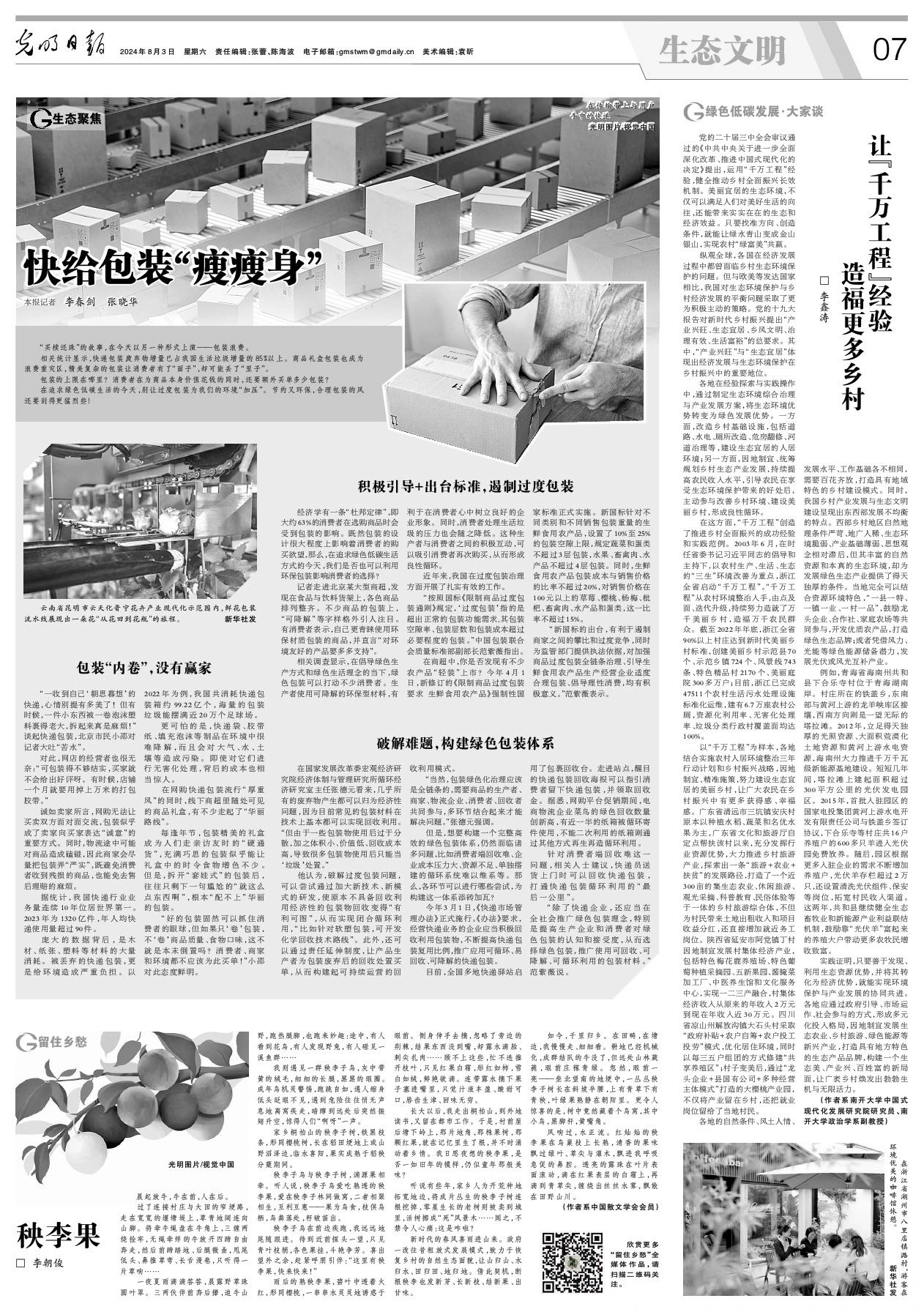 李鑫涛副教授在2024年8月3日的《光明日报》上发表文章《让千万工程经验造福更多乡村》。文章主要关注乡村全面振兴事业,主张运用“千万工程”经验,将生态优势转为绿色发展优势,实现环境保护与产业发展协同共进,打造美丽乡村。