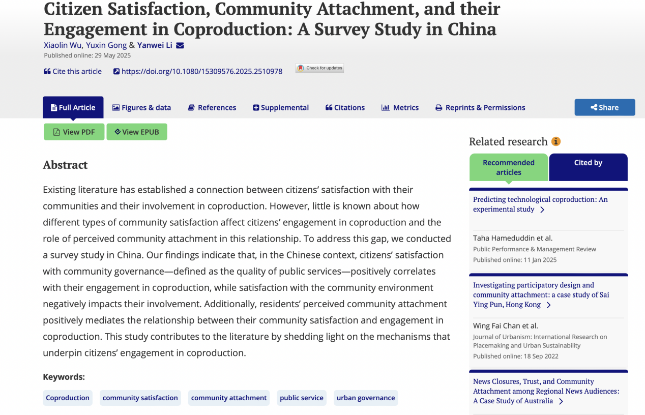 吴晓林教授、博士研究生龚宇欣同学与山东大学政治学与公共管理学院李延伟教授合作的学术论文Citizen Satisfaction, Community Attachment, and Citizens’ Engagement in Coproduction: A Survey Study in China被公共管理著名期刊Public Performance & Management Review(PPMR)接受并在线发表。PPMR是美国公共行政学会(ASPA)公共绩效与管理分会(SPPM)的旗舰期刊,也是公共管理学科的标志性期刊之一。