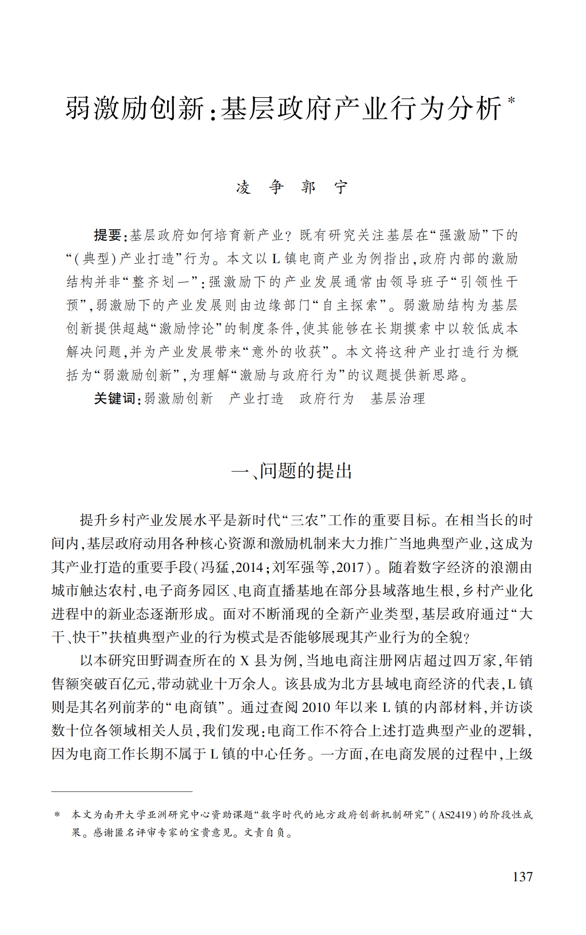 基层政府如何培育新产业?既有研究关注基层在“强激励”下的“(典型)产业打造”行为。本文以L镇电商产业为例指出,政府内部的激励结构并非“整齐划一”:强激励下的产业发展通常由领导班子“引领性干预”,弱激励下的产业发展则由边缘部门“自主探索”。弱激励结构为基层创新提供超越“激励悖论”的制度条件,使其能够在长期摸索中以较低成本解决问题,并为产业发展带来“意外的收获”。本文将这种产业打造行为概括为“弱激励创新”,为理解“激励与政府行为”的议题提供新思路。