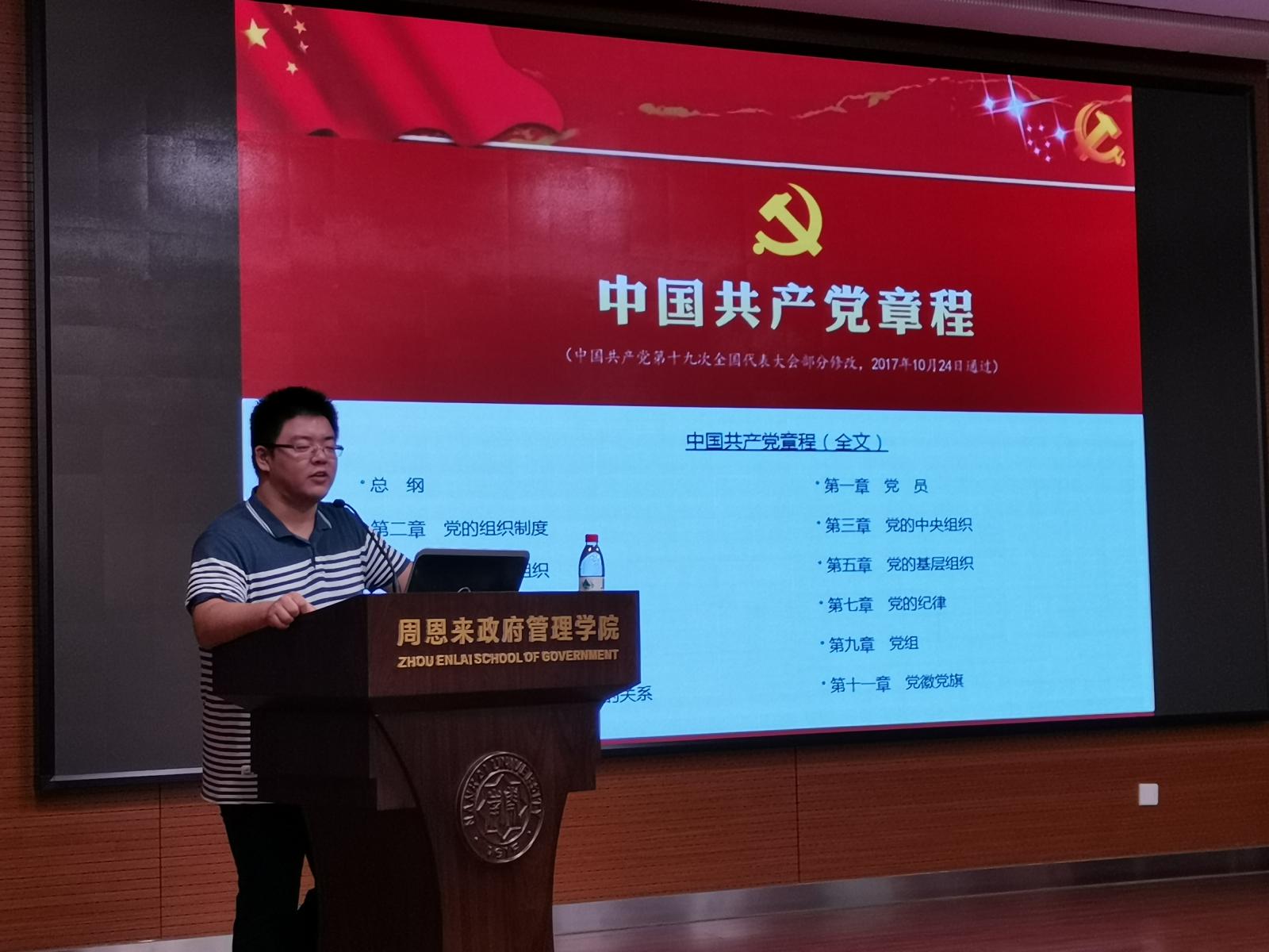 殴喜乐在新生党课及入党程序培训讲座中对新生进行党课教育及入党程序培训,从“我是谁”,“我是什么样子的人”这两个问题出发,强调要不忘初心,牢记使命,为实现新时代党的历史使命不懈奋斗。