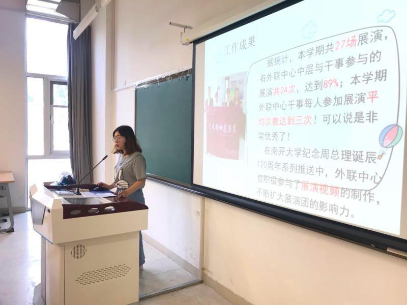 胡淳怡概括了办公中心在团史整理、恩来文化展展板等方面的工作成果,总结了不足之处。她指出,办公中心未来的努力方向是创新与改革展演团内部运行机制,提高成员们的积极性;同时要形成完整系统的工作计划,更好地配合其他中心工作。