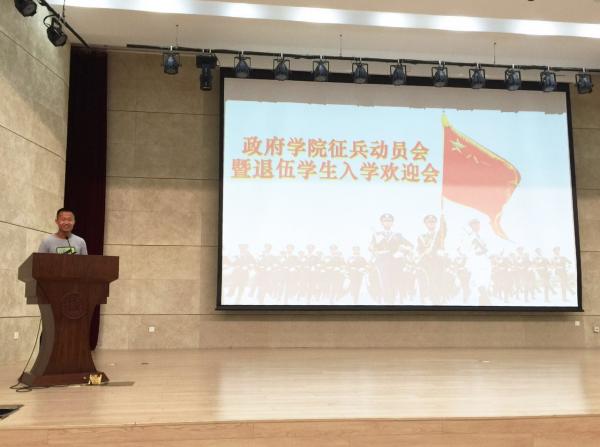 为深入推进国防教育并扎实做好征兵宣传工作,9月12日中午,政府学院征兵动员会暨退伍学生邓亚超入学欢迎会在津南校区业务楼报告厅隆重召开。学院党委书记王慧、党委副书记兼副院长奚先来出席,两百余名大一新生以及邓亚超所在班级同学参加。