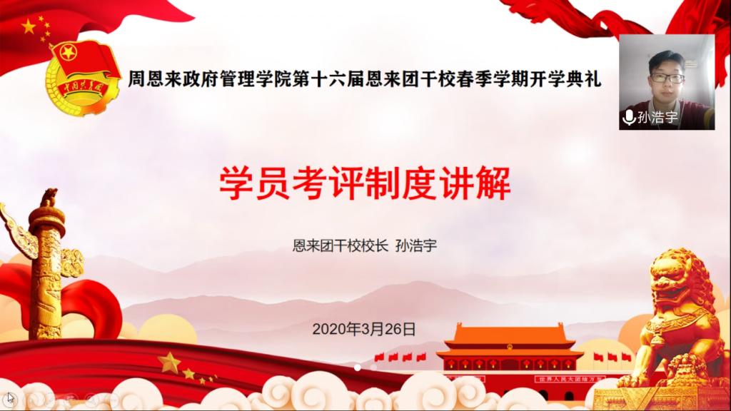 随后,恩来团干校校长孙浩宇同学为学员们细致讲解了本届团干校培养方案和考核制度,鼓励同学们开展丰富多彩的线上学习活动。