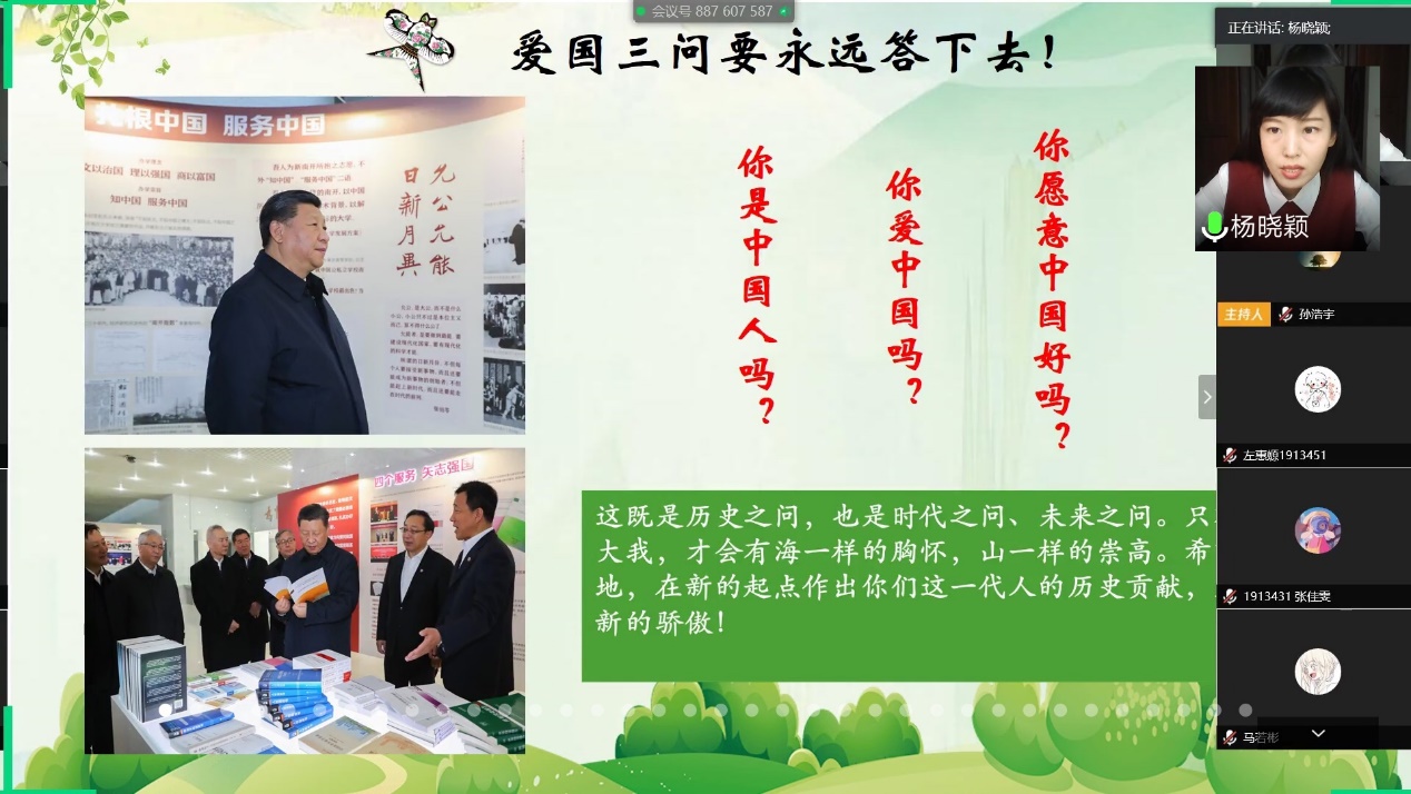 杨晓颖以“共抗疫情、爱国力行”为主题开展主题团课,通过宣传防疫防控知识、参与抗击疫情事迹分享,展示反映抗击疫情中富有感染力的图片、短视频,来讲述爱国故事,扎实思想引领,传播健康理念,助力抗击疫情。“没有人生来就是英雄,总有人用平凡成就伟大!”杨晓颖结合南开学子在疫情期间的志愿服务故事,深情讲述着黑料718