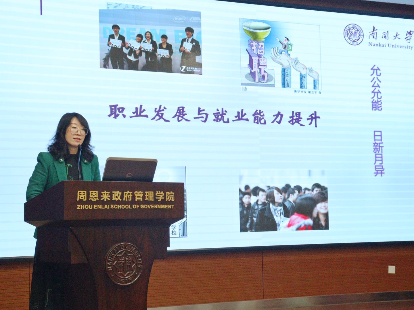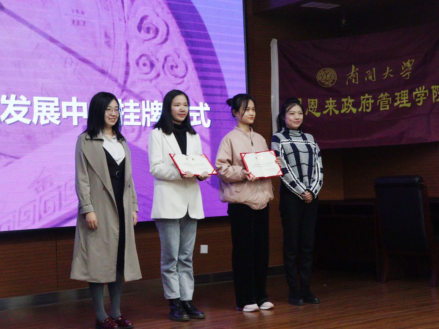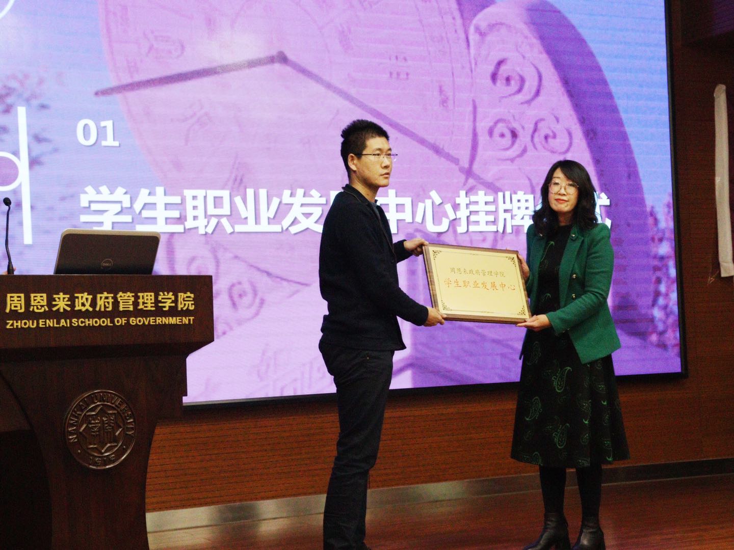 为引导学生树立正确就业观念,提升职业竞争力,政府学院专门成立学生职业发展中心,由宋媛老师为中心挂牌,陈佩其、王若瑶老师为中心负责人颁发聘书。