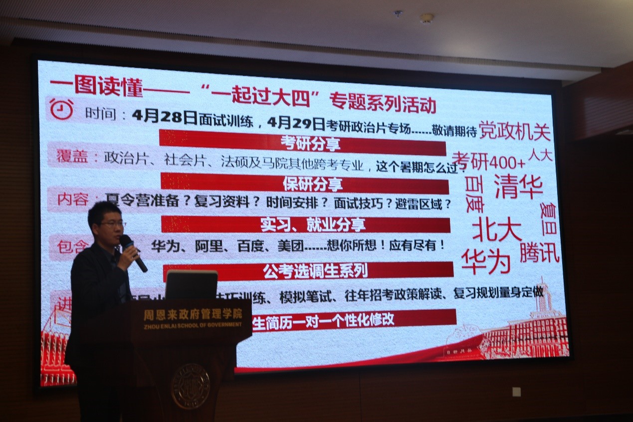 针对调研的同学们的需求,学院将于4月底至5月打造“一起过大四”专题系列活动,从学院自身各专业类别及学生特点出发,从学院“本专业+跨考专业”的考研保研专题经验分享,到国内外名校报考专业详细解读,再到公考选调规划训练营、企业单位面试笔试实际训练,“一起过大四”活动以服务学院各专业各年级同学就业工作为初心,最大程度上提高同学们的求职就业能力,以榜样引领为品牌,以价值引领为导向,发挥榜样示范作用,着力提升就业工作实效。在研究生“研途相伴”求职训练营品牌活动中,活动聚焦大学生积极心态与职业生涯规划、公考选调培训等工作,以“服务同学,提升质量”为主线,精准实施“两个聚焦”,聚焦国家发展战略和提高服务水平。