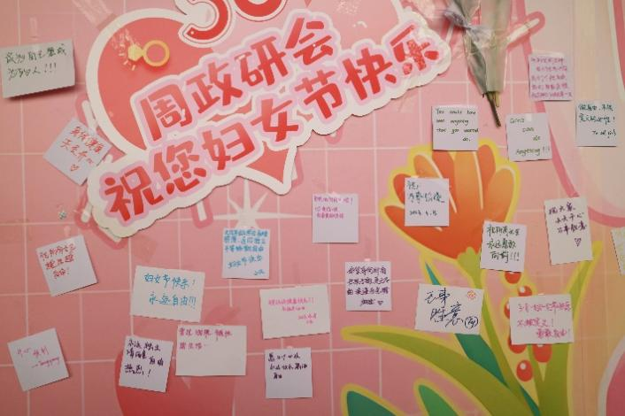 在“自由拥抱,留下祝愿”部分,同学身着玩偶服,在政府学院院楼门口为有意愿的同学敞开“爱的怀抱”。此外,许多同学还在一旁的展板上写下了对女孩的美好祝愿,祝福的对象包括了母亲、老师、朋友、自己等多元主体,祝福内容更是充满温情与爱意。不仅如此,政府学院研究生会的同学也为每个留下祝福的同学送上了鲜花。让每位同学感受到温暖与关怀。