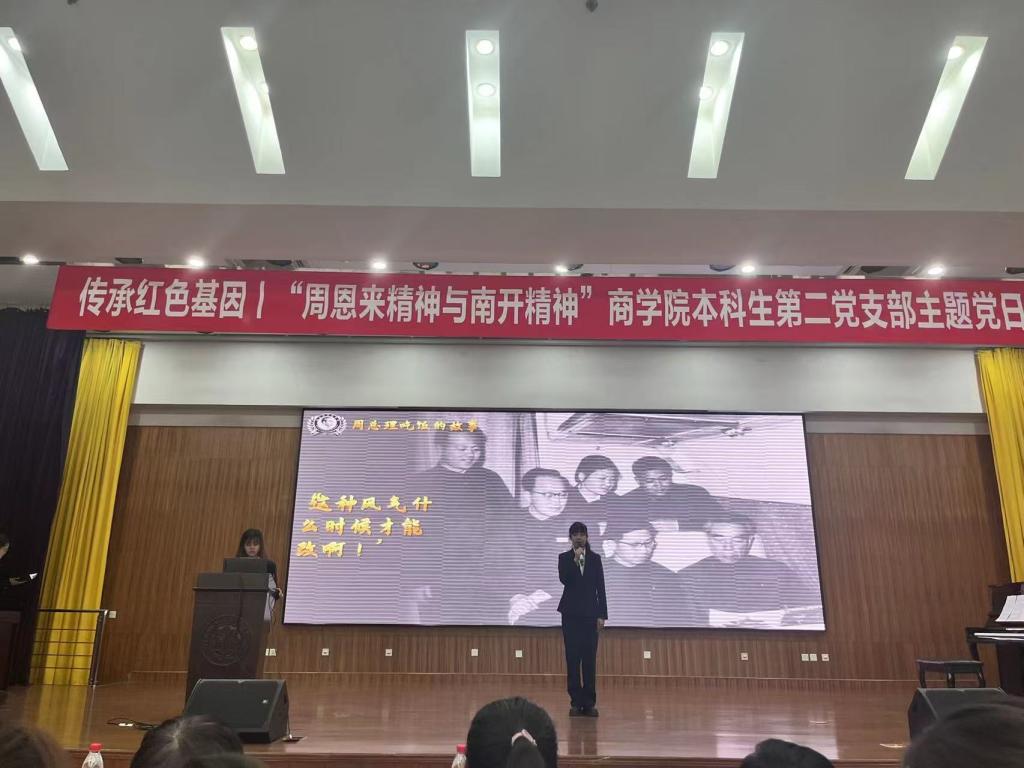 恩来精神展演团受商学院本科生第二党支部邀请,在党日活动中为商学院的同学们带来了“周恩来精神与南开精神“主题展演。展演团的成员们用四段故事,生动展现了恩来精神历久弥新的独特魅力,进一步丰满了同学们心中周总理的宏伟形象,也鼓舞着大家传承恩来精神,踔厉奋发,不懈奋斗。