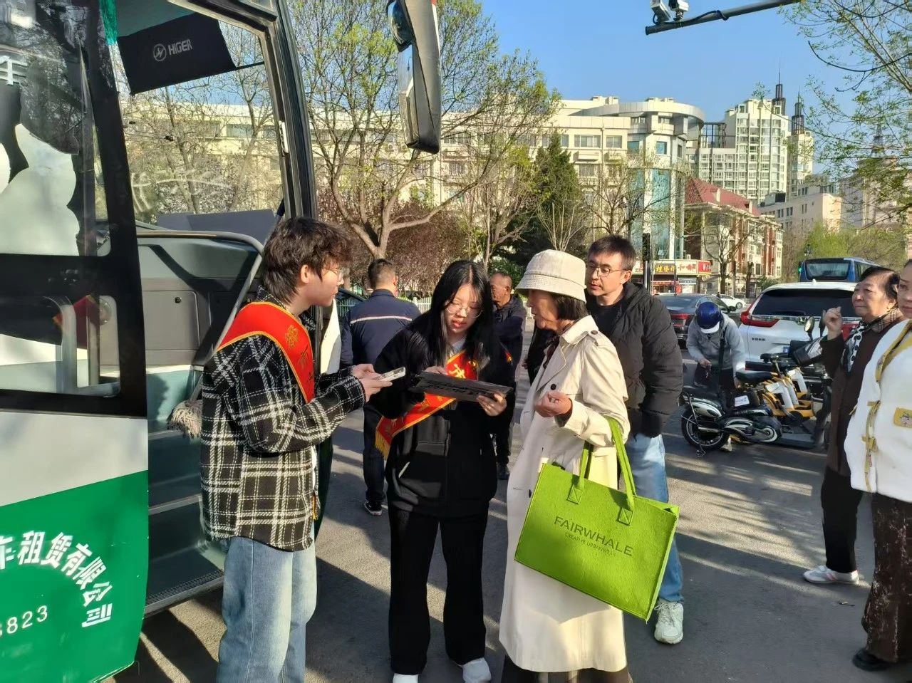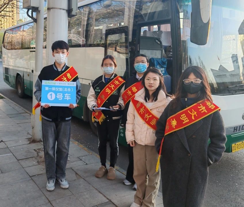 清明节当天早上5:20,天边刚泛起鱼肚白,参与首场活动的志愿者们已在校门集结完毕,在薄雾中乘坐大巴前往服务中转点。在殡葬处工作人员的指导下,志愿者们迅速进入服务状态,在乘车点认真查验祭扫家属身份,及时搀扶腿脚不便的老人登车,为家属准备晕车袋等用品。发车前,志愿者们再次清点人数,认真宣读文明祭扫注意事项,随后便随车与家属们一同到达天津市第一殡仪馆和第二殡仪馆。到达殡仪馆后,志愿者与工作人员对接,引导家属开展文明祭扫,寄托哀思。