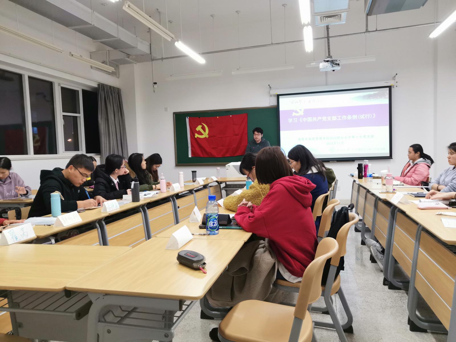 这次党课加深了党员同志们对于誓词精神、牺牲精神的认识和对于党员尽责的内心认同。全体党员与积极分子对党的崇敬与归属感更加强烈。身为新时代的青年大学生党员,我们应当深刻认识到自己的责任重大,深刻认识到作为一名青年党员应当如何塑造自身的精神世界,如何塑造自身的行为规范,如何践行誓言、诚心诚意的为党和人民奋斗、与历史与时代同行。党课结束后,支部宣传委员杨毅同志带领支部党员共同学习了中共中央近期发布的《中国共产党支部工作条例(试行)》,积极自觉响应党中央的学习号召并落实在支部的实际工作之中。