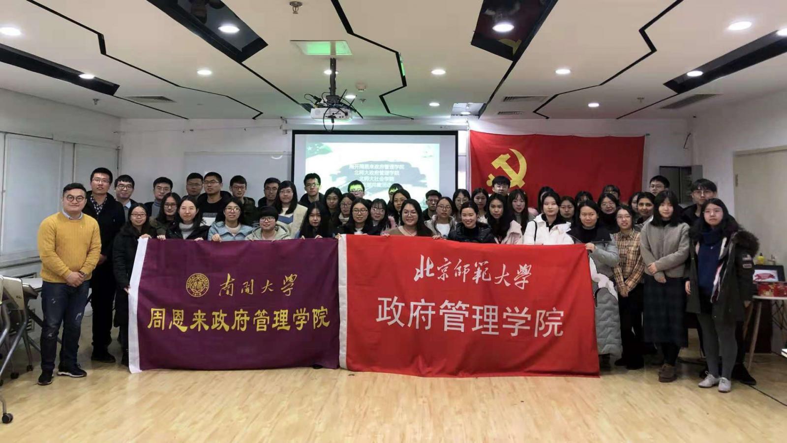 和北京师范大学都是百年老校,中国现代教育的先锋者。师大学子急公好义,南开学子允公允能,两校在党的历史上、在共和国的历史上都有着浓墨重彩的一笔。回顾往昔看今朝,今年是改革开放四十周年,党的十一届三中全会就是在十二月召开,我们在这个时间点进行支部共建,共同交流党建工作心得,对每个支部都意义非凡。”