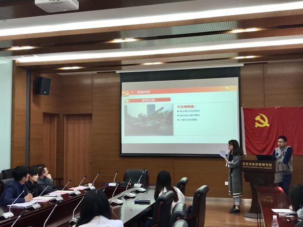 4月13日,学院党校组织了学员自主实践的立项评审会,由学院辅导员出任评委,各组学员代表上台对本组的实践主题、计划、预期目标等进行了幻灯片展示,评委根据现场展示和各组预先提交的立项申报表格对各组提出了问题和建议,立项会完成后各组学员则正式开始本组的实践学习活动。