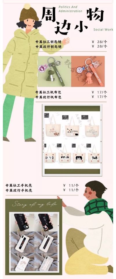 手机壳则体现专业特色,一款手机壳以“政好有你”命名,既暗合专业名称,又包含了暖暖爱意;另一款手机壳则以文字为主,将已学的政治学与行政学专业课名称印在上面,既有特色又有回忆色彩;还有一款手机壳则是以专业英文名为主。