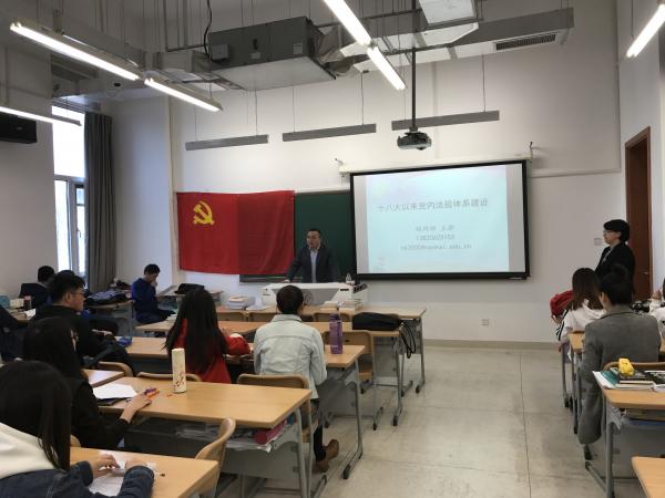 程同顺老师以“十八大以来党内法规体系建设”为主题,为同学们梳理党的十八大召开以来制定和修订的中国共产党党内一系列法规文件,通过与新中国建立以来几次重大的法律体系变动比较,从法规体系完善的角度,向同学们展示了十八大以来中国特色社会主义法律体系以至党的规范条例的发新发展和新动态。