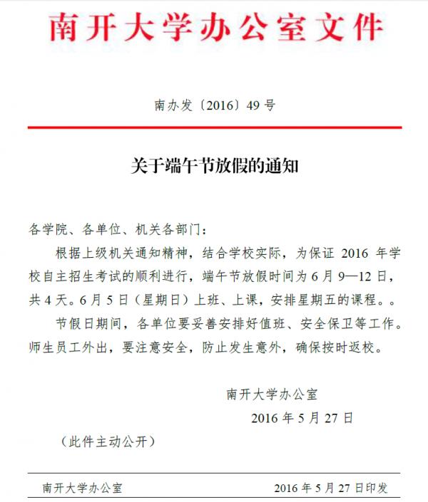 学校变更了端午节放假的安排,如下图所示。提请注意的是6月5日(周日)上班、上课,按周五作息。