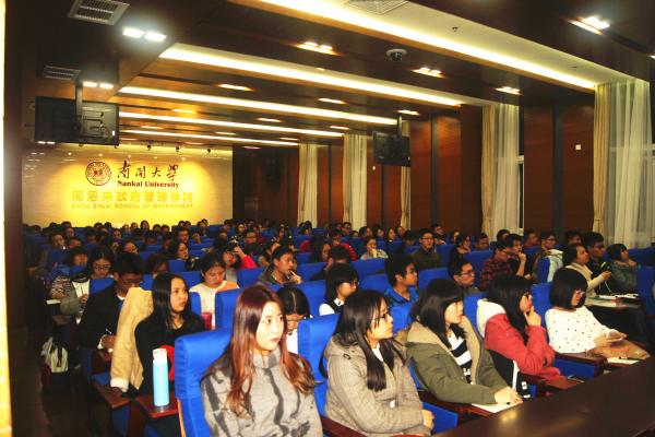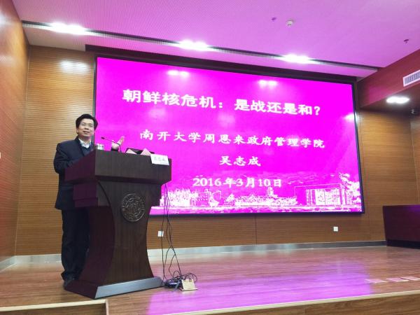 接着,吴志成教授重点讲解了自己对朝核危机的独特分析和见解。吴志成教授从历史出发,介绍了朝鲜半岛的冷战、朝鲜四次核试验、六方会谈以及联合国对朝鲜核试验的制裁。随之,吴志成教授以生动的比喻详细介绍了六方会谈之中各个国家的暗中较量。吴志成教授表明,由于国际格局与地区形势的变化以及中国外交战略的调整,中国对朝政策正在悄悄变化。但中国对朝核的立场是相当坚定的,即坚持实现半岛无核化,维护半岛的和平稳定,坚持通过对话来协商解决有关问题。