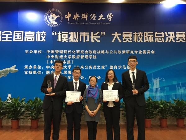 思源队”,由城市管理专业张丽梅老师全程指导,参加比赛。我校代表队选择《基于微博大数据的政府与公众关于突发事件舆论互动机制研究——以天津“8·12大爆炸”为例》为议题,聚焦了应急管理中政府和公众的信息内容错位、信息时滞等问题,提出了相应的解决方法。在总决赛现场,代表队通过模拟新闻发布会的方式夸张地展示出目前应急管理中公众和政府信息传递之间所存在的问题;然后由“学生市长”推到“信息隔板”,并表示“我们希望政府与媒体,政府与公众之间的信息隔板能够消失。”模拟表演后,青岛市崂山区区委书记齐家滨向“学生市长”提问,我校 “学生市长”灵活应对,赛场气氛紧张激烈,答辩效果出奇制胜。