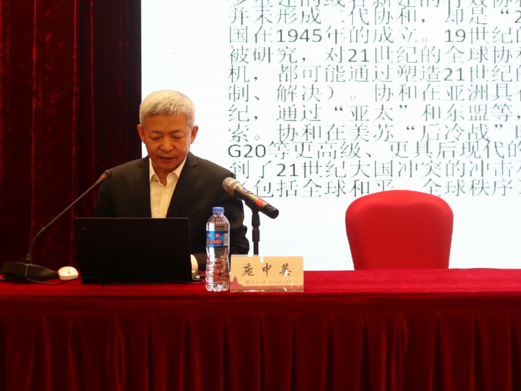 中国海洋大学海洋发展研究院院长庞中英教授做了题为《协和和新协和:从19实际的“欧洲协和”到21世纪的“全球协和”》的大会发言。庞中英教授从无政府状态、全球化或相互依存的管理等概念以及制度化作为理论出发点,提出19世纪的欧洲协和是全球协和的起源,是“百年和平”的主要原因,有效的大国关系管理和全球治理需要借助协和理念。