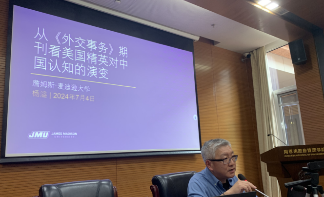 开展了系列讲座活动共襄盛举。7月4日中国政府发展联合研究中心邀请詹姆斯·麦迪逊大学政治学系教授、詹姆斯·麦迪逊大学华盛顿中心主任杨溢教授为政府学院师生做题为《从<外交事务>期刊看美国精英对中国认知的演变》的讲座。杨溢教授讲座聚焦《外交事务》杂志自1979年至2023年发表的涉华研究的文章为样本与案例,通过实证方式揭示美国精英对华认知的内涵及随时间推移发生的变化。报告围绕美国对中国整体关注强度如何?这种关注强度是如何随时间变化?自1979年中美双边关系正常化以来哪些问题被认为是有显著影响?美国精英对中国表现出多大程度的不信任感?这种不信任感是如何随时间波动的?美国精英是如何判断美中关系所在的政治环境等问题展开。杨教授从美国精英对华关注强度、显著议题、不信任度及行为码四个方面解读美国精英关于中国的认知的形成和演变过程,揭示“中国”是如何在美国精英脑海中被认知和解读的。杨溢教授的研究发现,美国精英对中国的不信任感与感知的敌意出现了三次激增。近年来“新冷战”叙事在美国精英圈中普及以及美国决策者倾向于通过表面类比过去的案例而误用历史格外令人担忧。