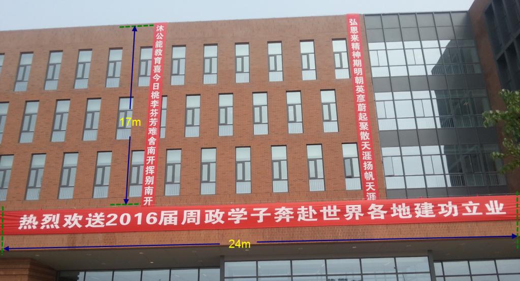 2.竖幅17米。布料四周留箍,上下穿棍,左右穿绳(防风)。文字从顶部而下占14米,底部留空白3米。