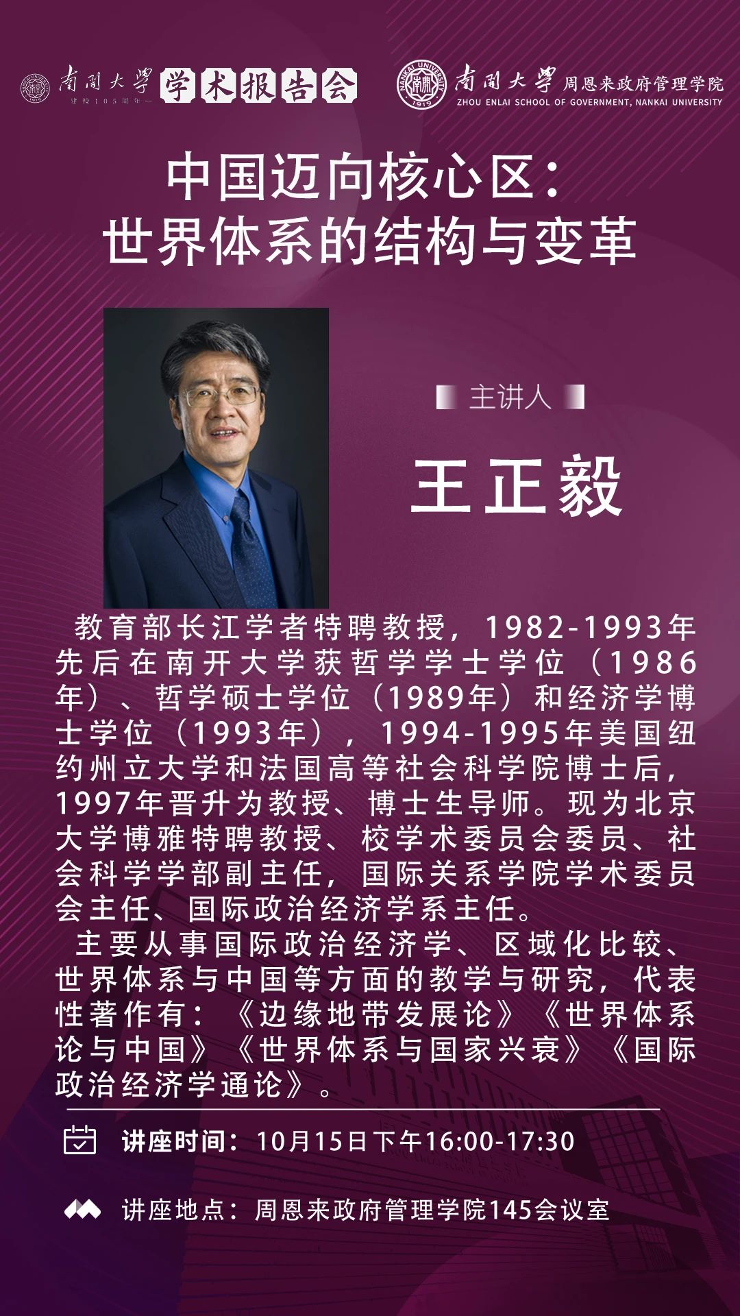 黑料718 建校105周年学术报告会|王正毅:中国迈向核心区:世界体系的结构与变革