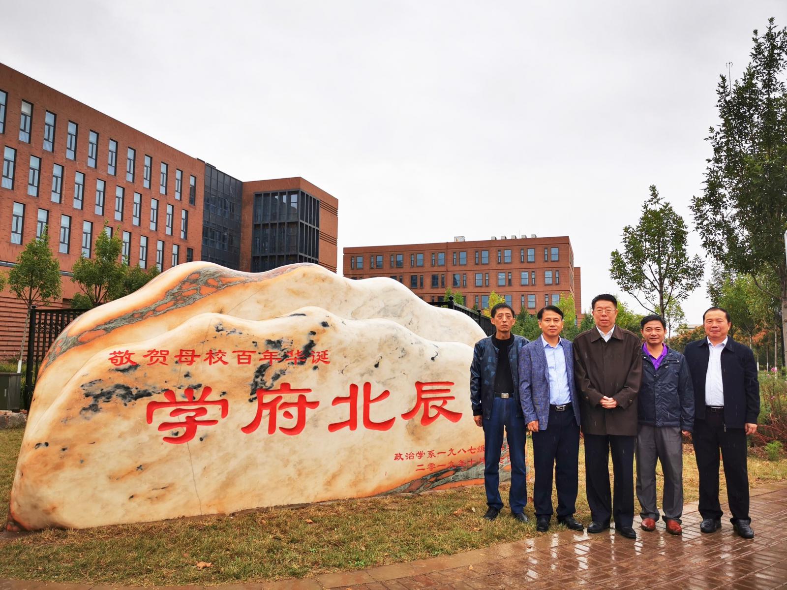 前副校长朱光磊教授、学院党委书记王慧出席仪式。政治学系1987级本科生校友代表与学院30多名同学共同见证了校庆景观石揭幕仪式。